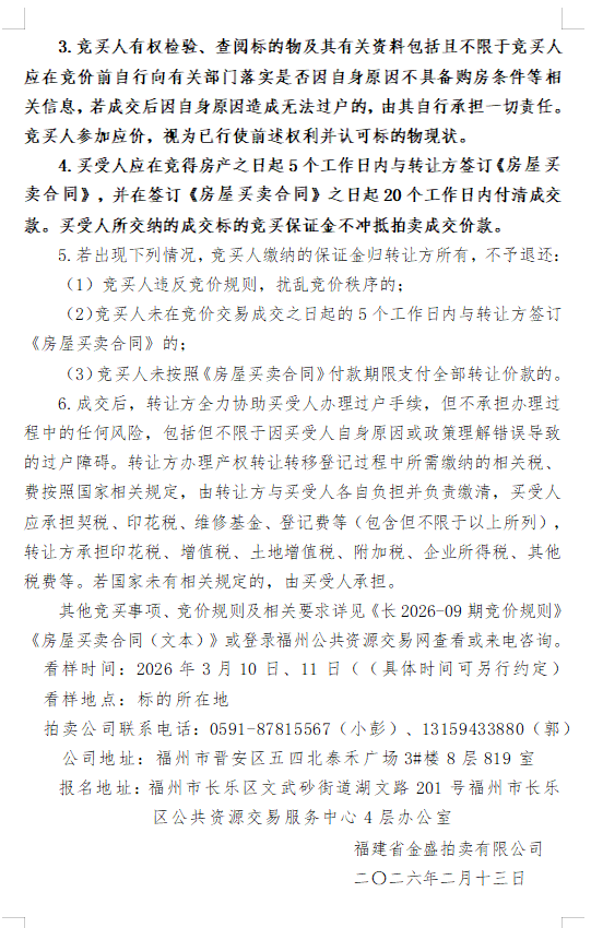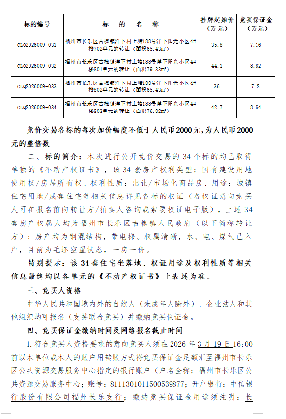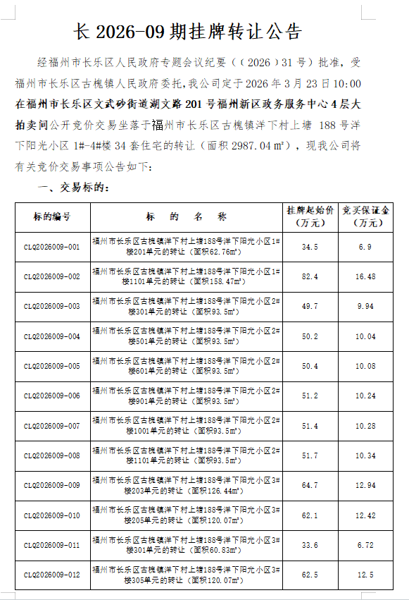 2026年3月23日福州市长乐区古槐镇洋下村上塘 188号洋下阳光小区1号楼——4号楼34套住宅的转让(拍卖会)